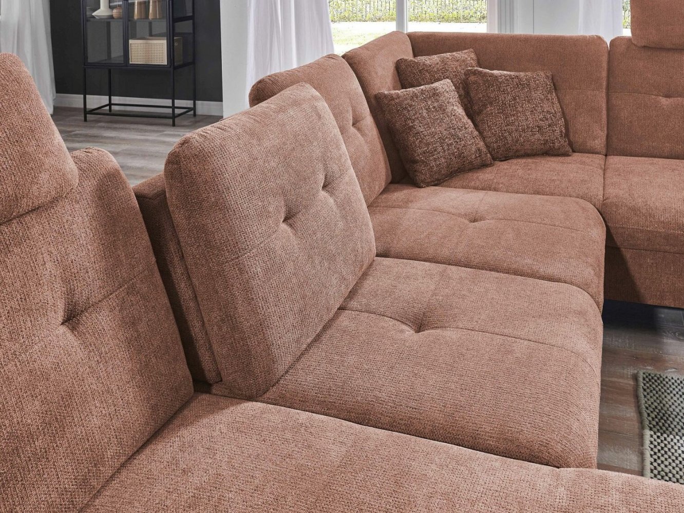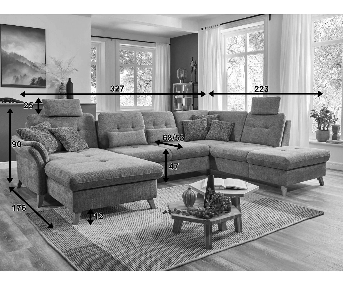 - 1ks rohová sedací souprava do tvaru U s nastavitelnou hloubkou sezení, rozměry 327/90/223 cm