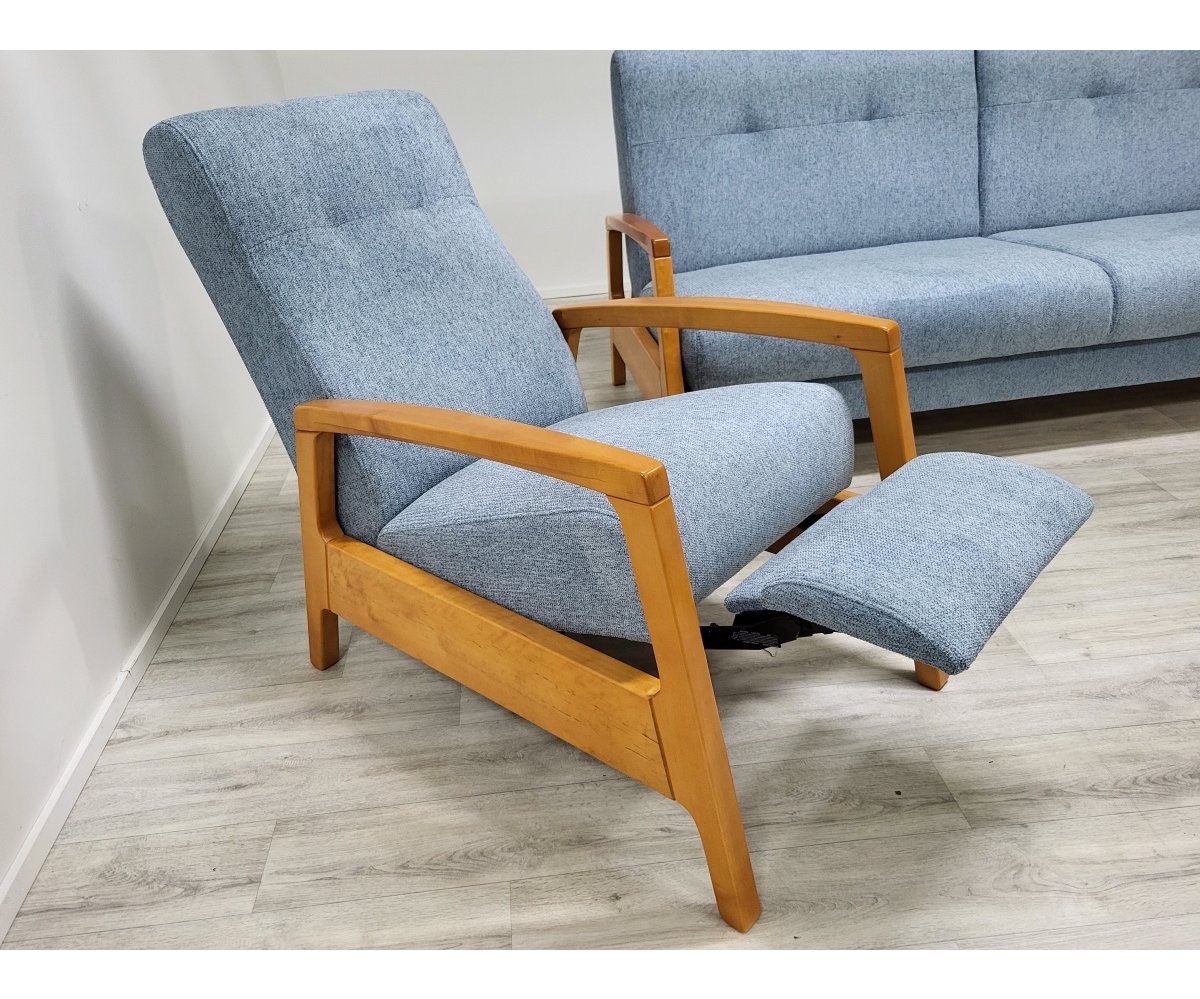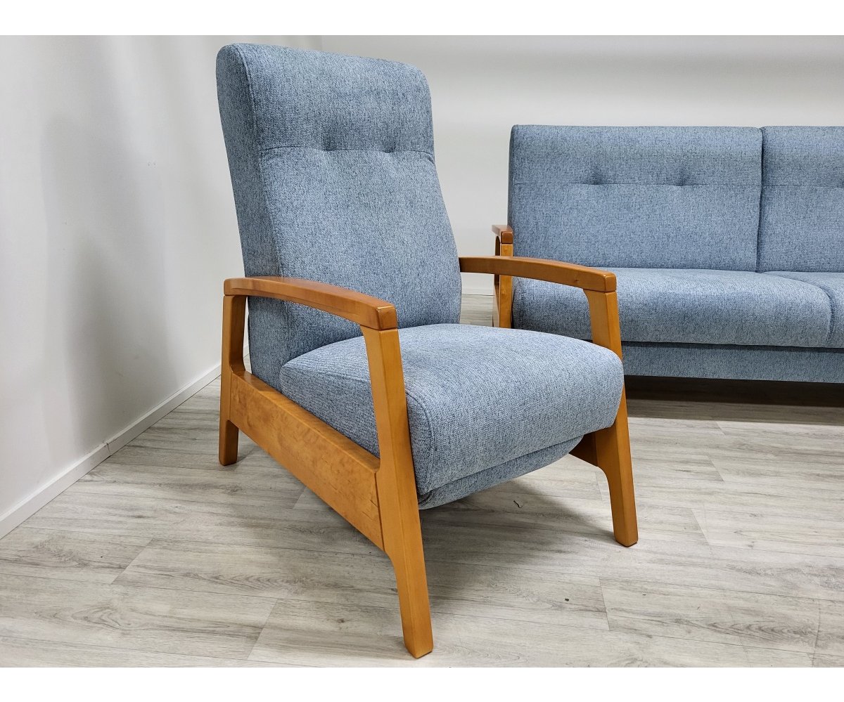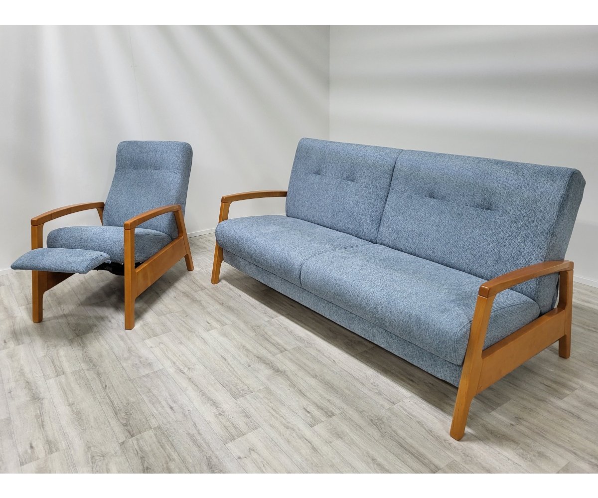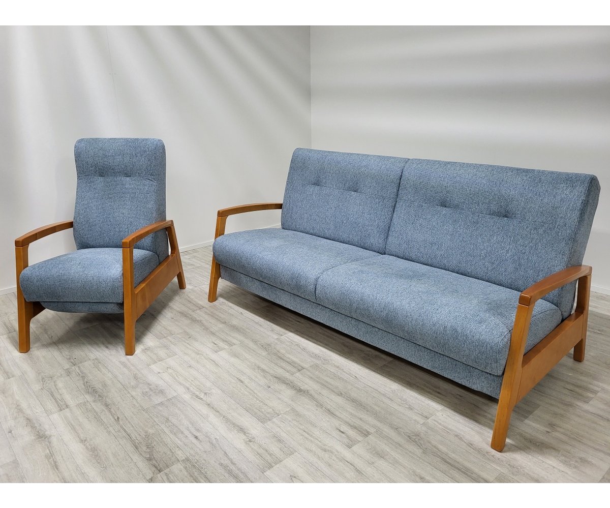 VÝPRODEJ: Sedací souprava ICONA kombinuje eleganci přírodních materiálů s funkcionalitu moderního designu. Hlavní materiály jsou dřevo a přírodní tkaniny, které společně vytvářejí příjemně teplý a přívětivý dojem. Pohovka je vybavena systémem klik-klak, což umožňuje snadné přeměnění na pohodlnou postel pro hosty. Pod sedákem je skrytý úložný prostor, ideální pro ukládání povlečení nebo jiných potřeb. Křeslo je vybaveno manuální funkcí relaxace, která umožňuje snadné nastavení optimálního pohodlí pro odpočinek.