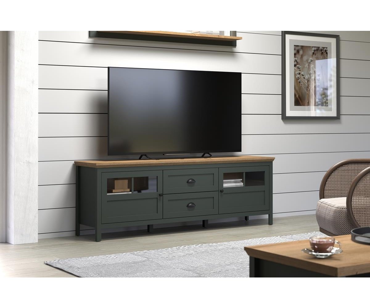 Elegantní televizní stolek z kolekce STANTON představuje funkční a designově sladěný základ každé moderní obývací sestavy. Kombinace tmavě zelených ploch s dekorem dřeva dub Evoke vytváří stylový kontrast, který působí nadčasově a zároveň velmi útulně.