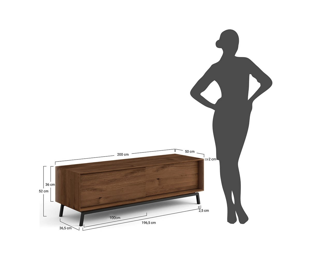 Komoda disponuje dvěma dvířky, za nimiž se skrývá praktický úložný prostor pro elektroniku či doplňky, zatímco horní deska pohodlně pojme televizor i dekorace.