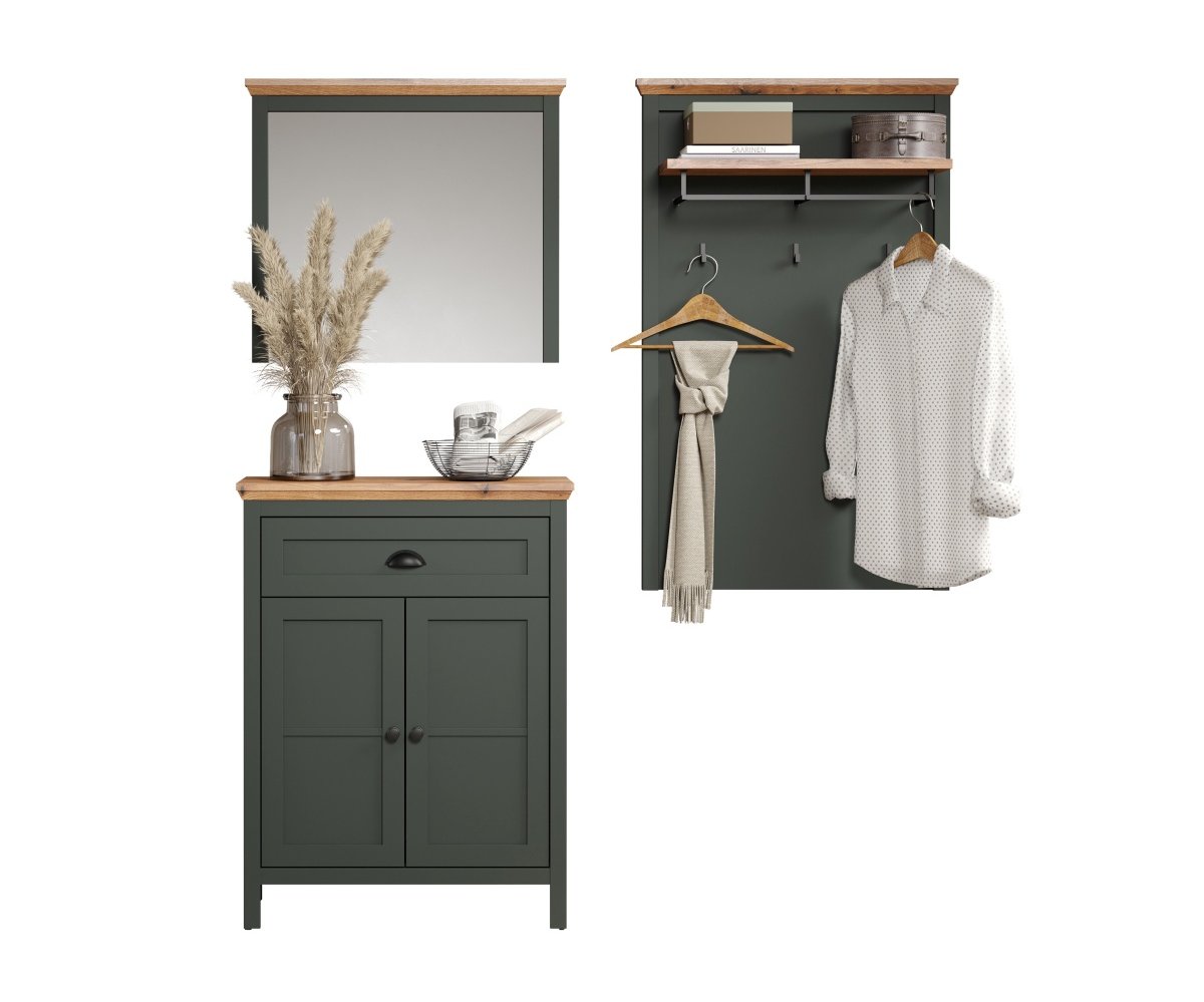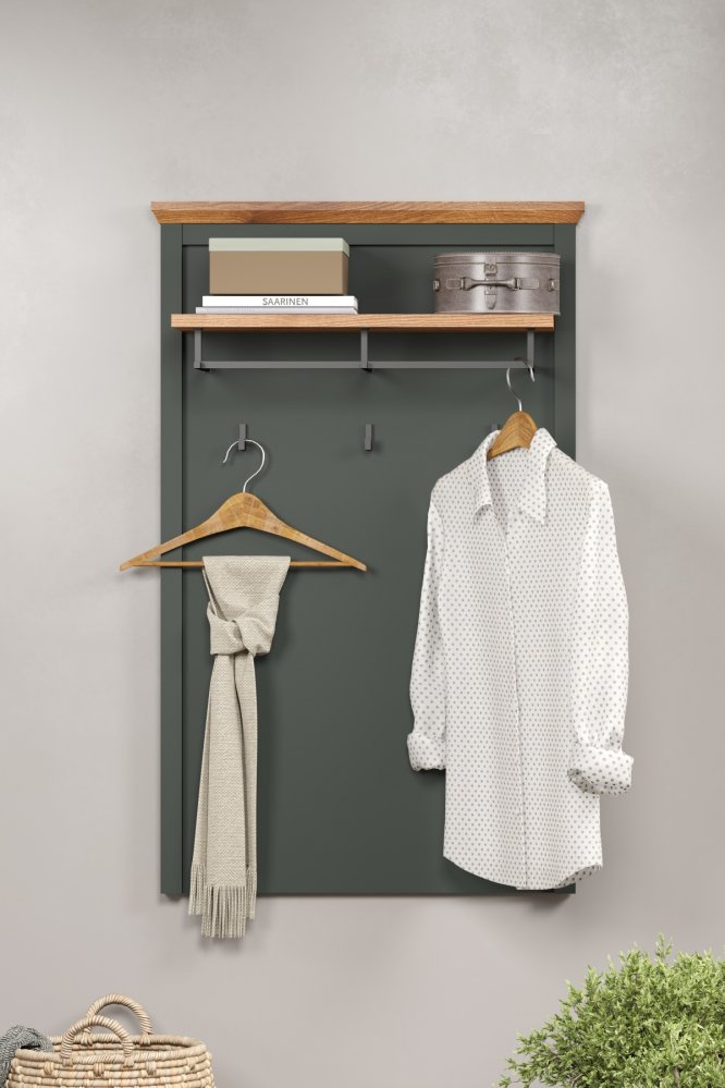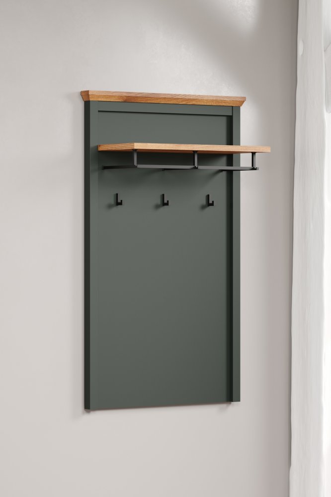 Tmavě zelené provedení dokonale ladí s ostatními díly sestavy Stanton, zatímco horní police v dekoru dub Evoke přináší příjemný přírodní kontrast a další praktickou odkládací plochu – ideální například pro klobouky, šály či dekorace.