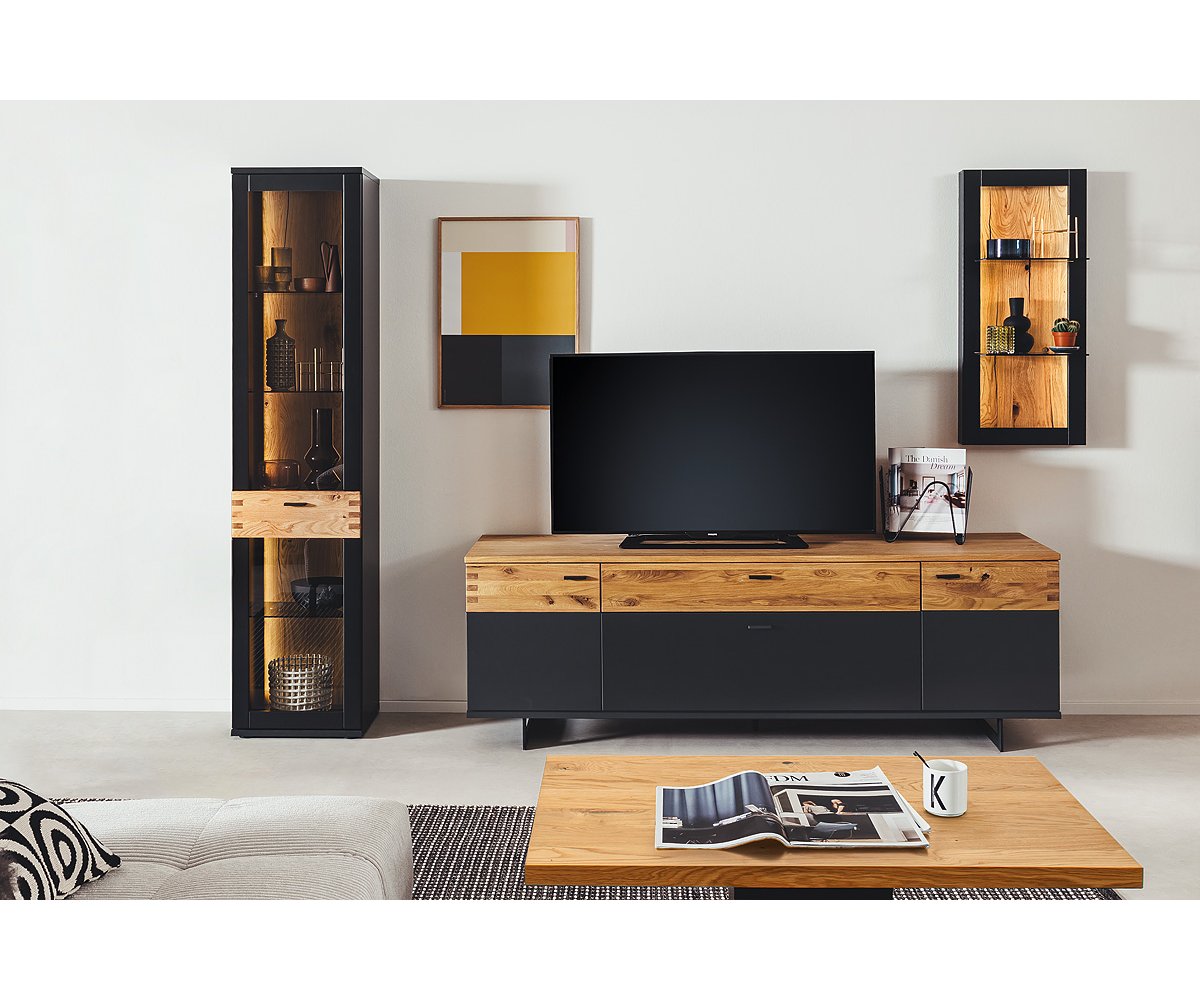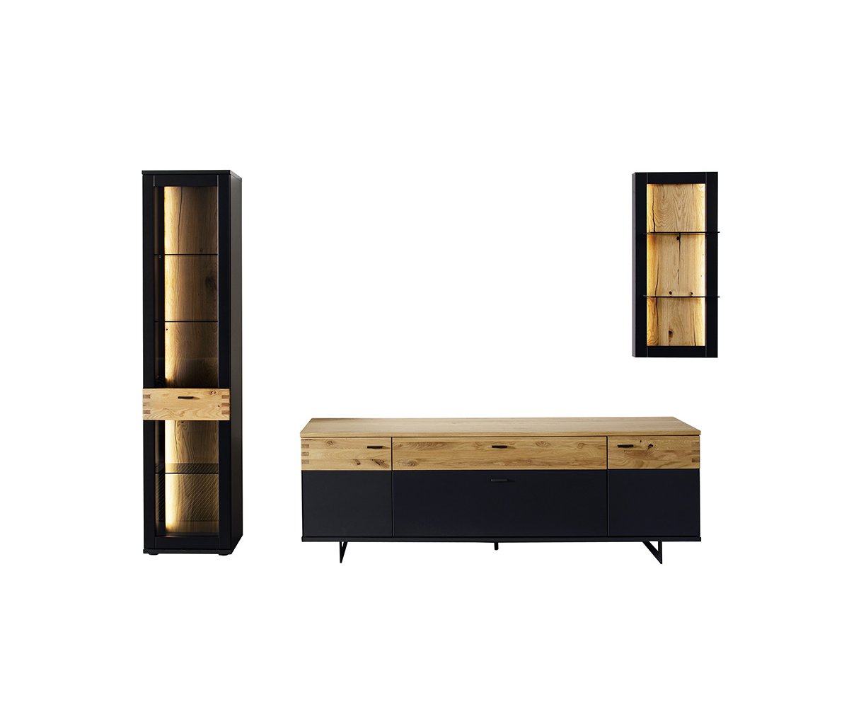 Korpus je proveden v grafitovém matném laku, který dodává nábytku nadčasový a sofistikovaný vzhled. Čelní plochy jsou doplněny o aplikaci v dekoru divokého dubu s olejovanou povrchovou úpravou, jež vnáší do interiéru přírodní kontrast a teplo.