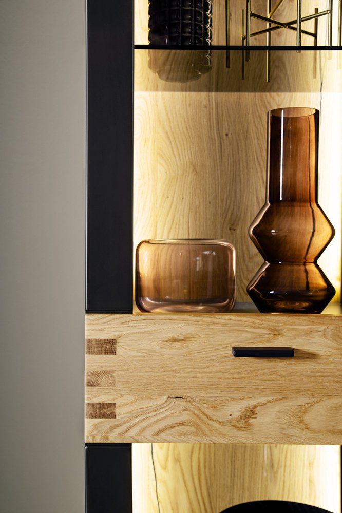 Díky svým štíhlým proporcím je vitrína vhodná i do menších prostor a snadno se kombinuje s ostatními prvky sestavy CESENA.