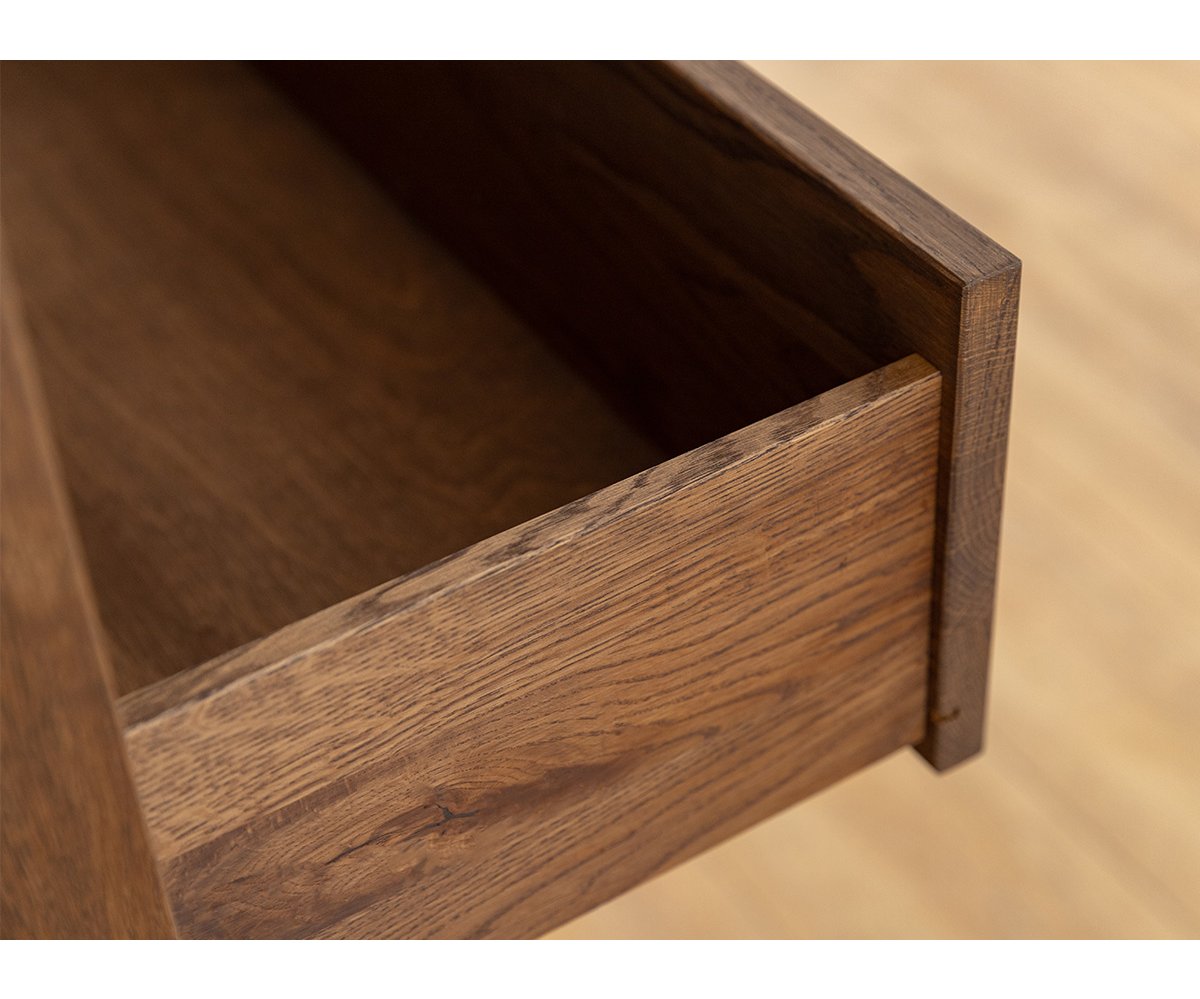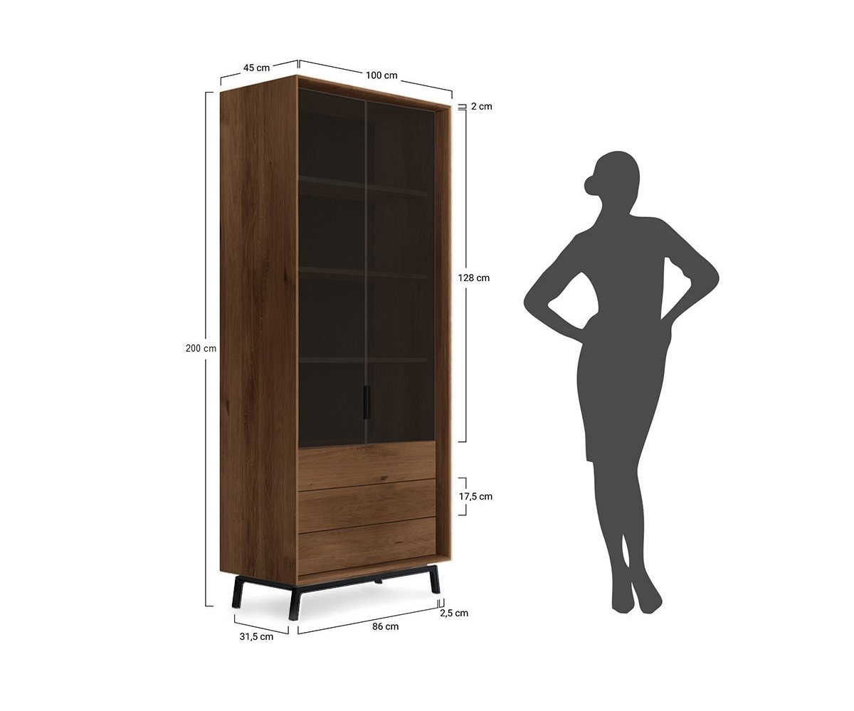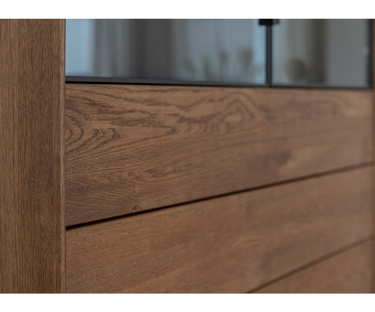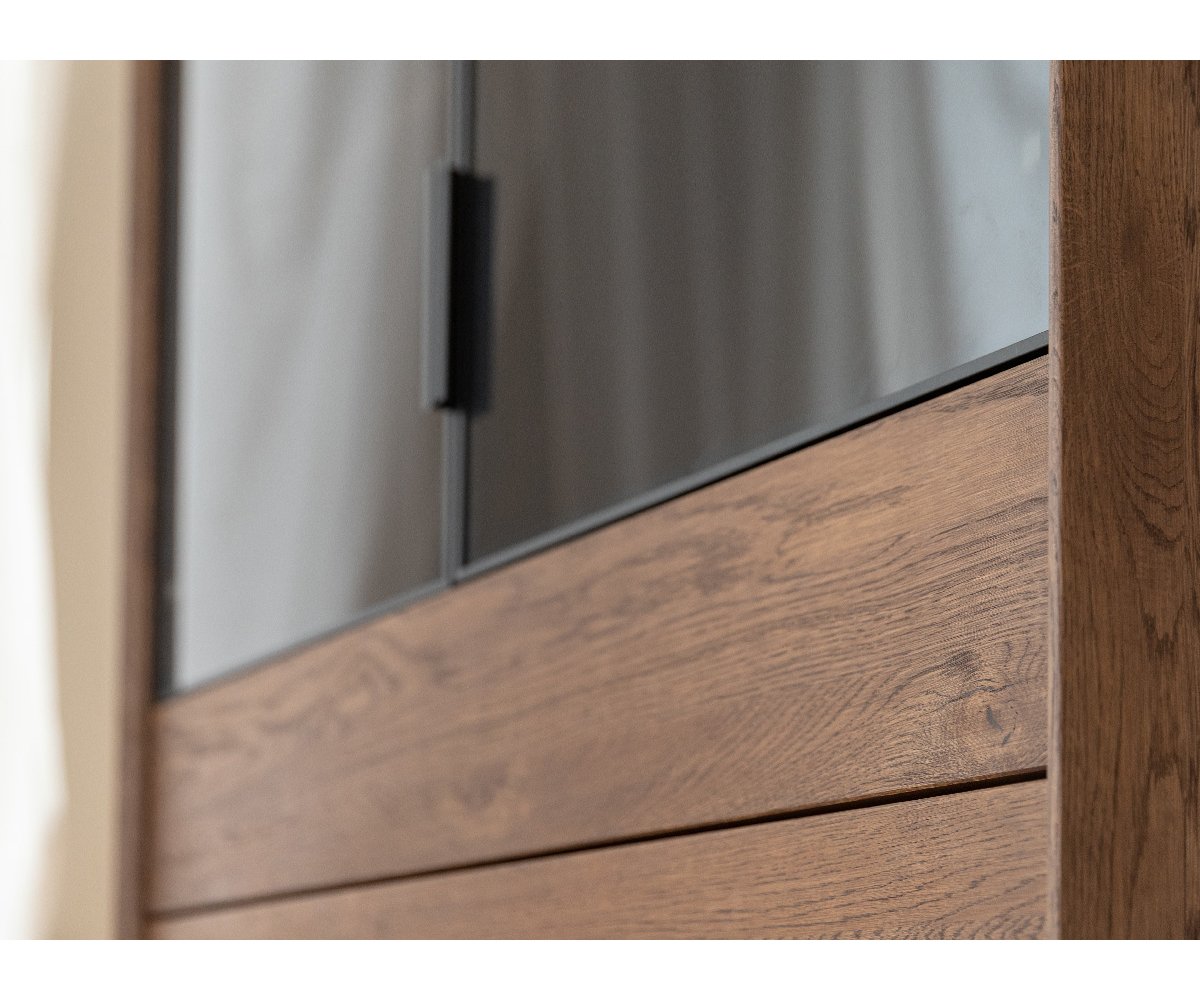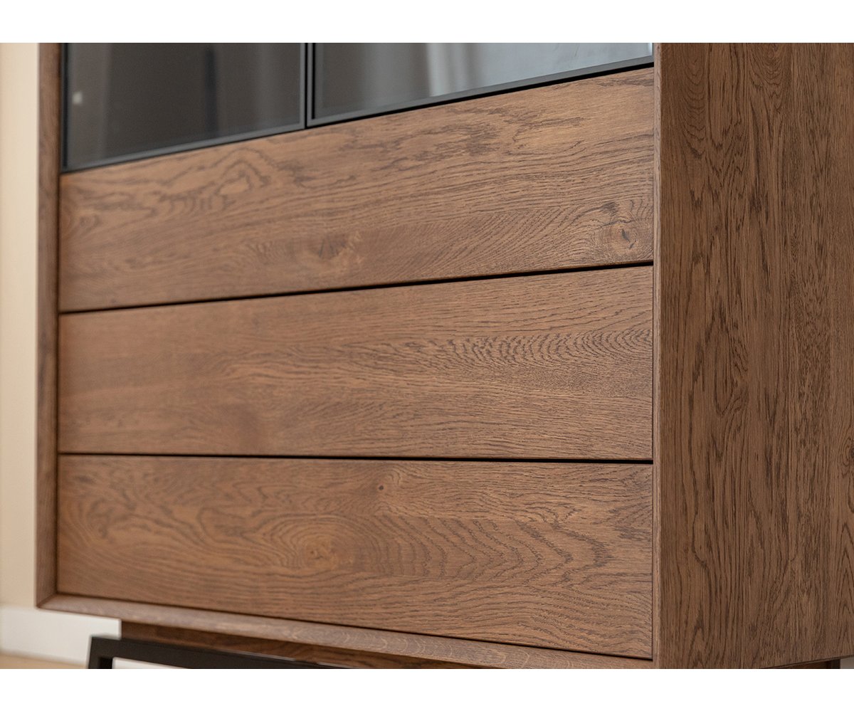 Elegantní vitrína LOFT přináší stylové spojení přírodního dřeva a moderního industriálního designu. Vyrobena z masivního olejovaného dubu v teplém odstínu tabák, nabízí atraktivní kontrast s černou kovovou podnoží. Vitrína PLMOL10ST disponuje kombinací plných a prosklených dvířek, takže část úložného prostoru umožňuje vystavit dekorace, skleničky nebo knihy, zatímco zbytek zůstává prakticky uzavřený. Díky kvalitnímu zpracování a přírodním materiálům se stává elegantní dominantou každého moderního obývacího pokoje.