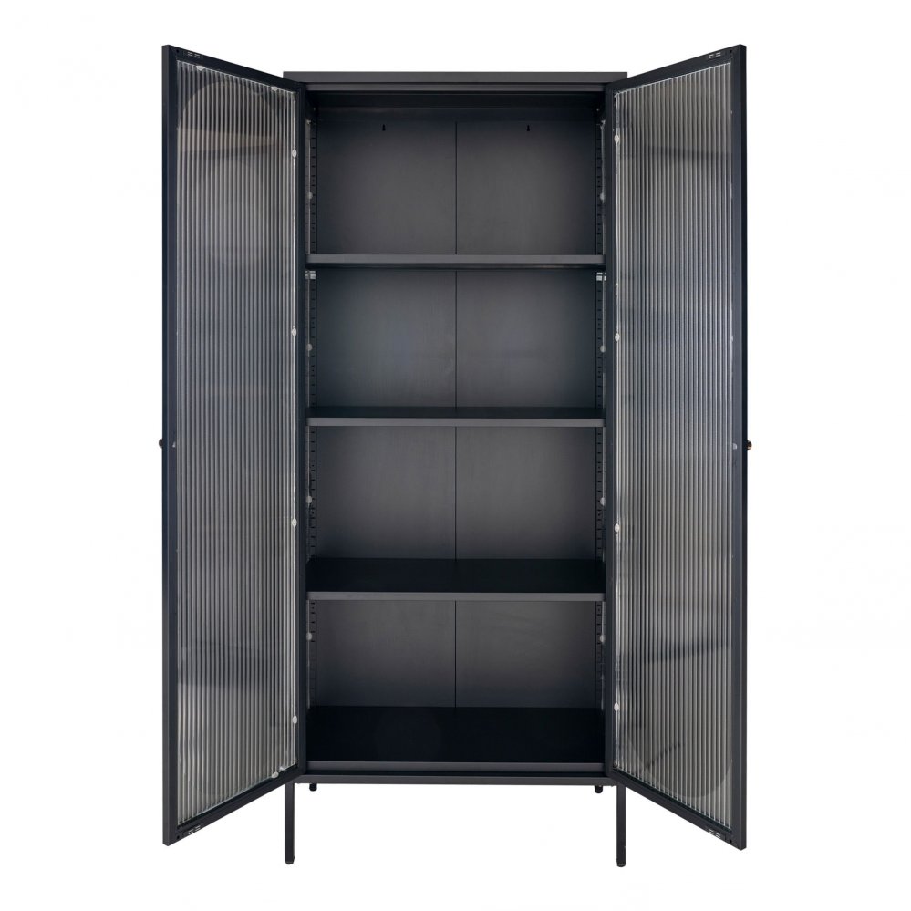 Vitrína Adelaide vyniká kombinací moderního industriálního vzhledu a funkčnosti. Je ideální pro ty, kteří hledají elegantní a praktický kus nábytku, který se snadno začlení do různých interiérových stylů. Kovový rám a fládrované skleněné dveře dodávají prostoru sofistikovaný a vzdušný dojem.