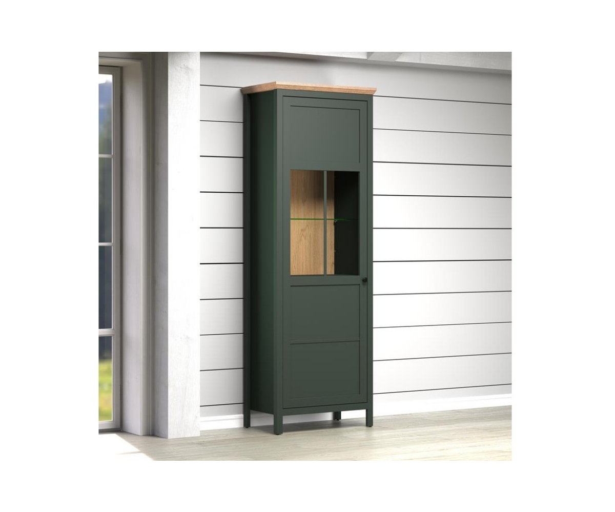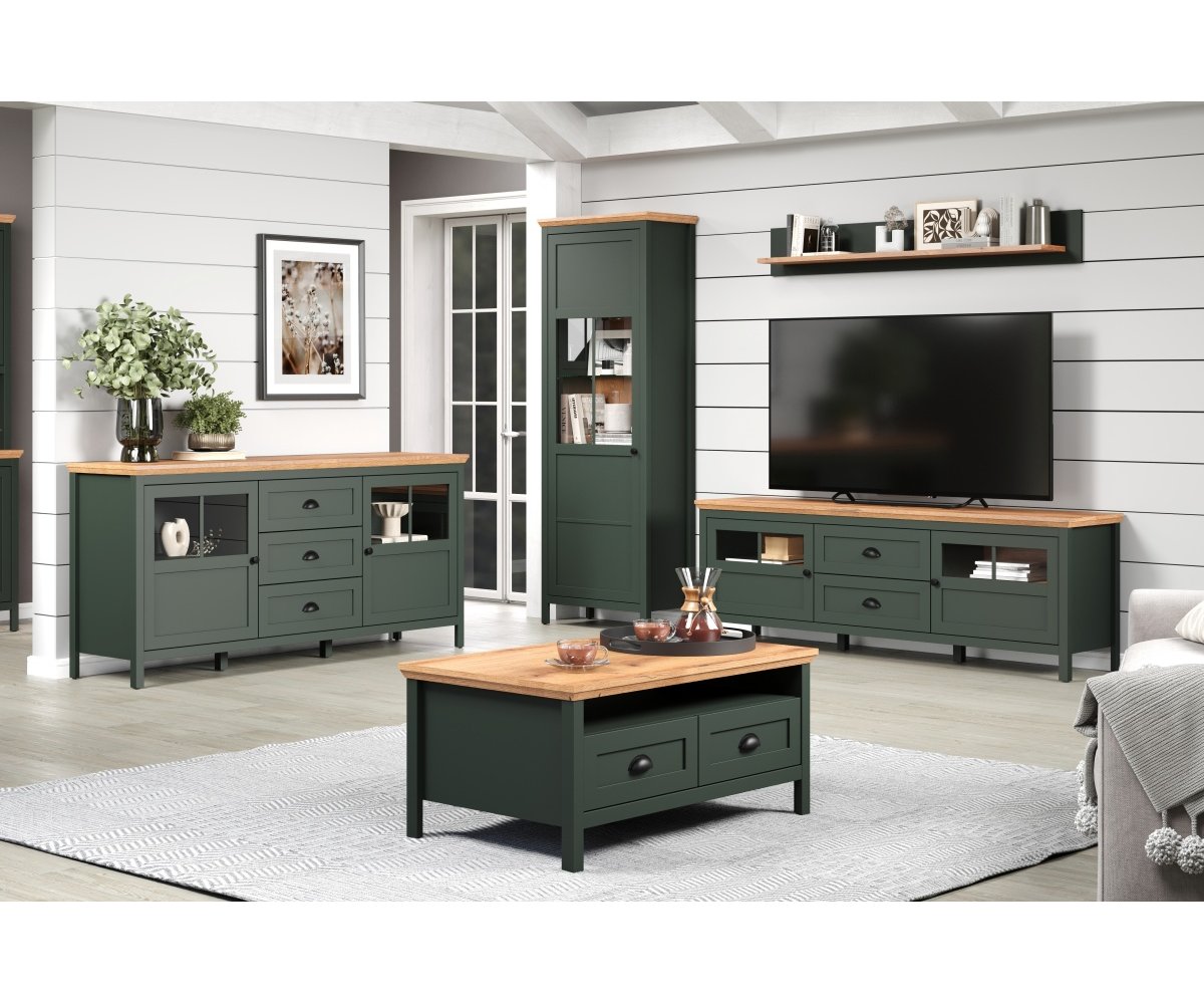 Elegantní vitrína z kolekce STANTON nabízí stylové řešení pro vystavení dekorací, skla nebo designových doplňků v obývacím pokoji. Kombinace tmavě zelených ploch s dekorem dřeva dub Evoke vytváří stylový kontrast, který působí nadčasově a zároveň velmi útulně. Celek doplňuje teplé LED osvětlení, které zvýrazňuje dekorace a podtrhuje atmosféru obývacího pokoje.